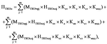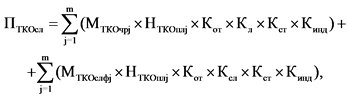 Сумма платежа за размещение твердых коммунальных отходов, определенная региональными операторами по обращению с твердыми коммунальными отходами, операторами по обращению с твердыми коммунальными отходами исходя из объема или массы размещенных твердых коммунальных отходов, определенных по результатам производственного экологического контроля в предыдущем квартале (ПТКО), определяется по формуле:
